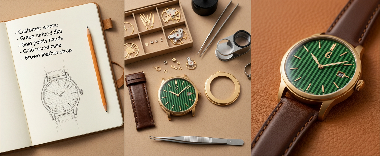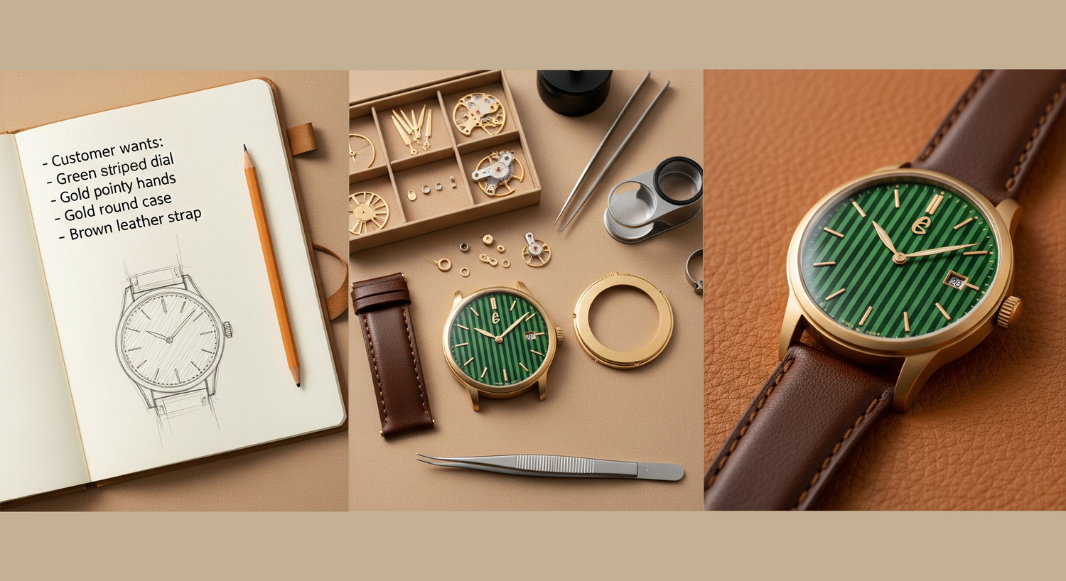 If our preset styles don’t match your vision, partner with us to craft a one-of-a-kind timepiece from scratch. Every detail is yours to choose — no templates, only your imagination